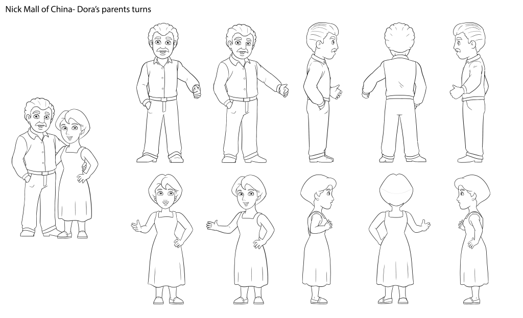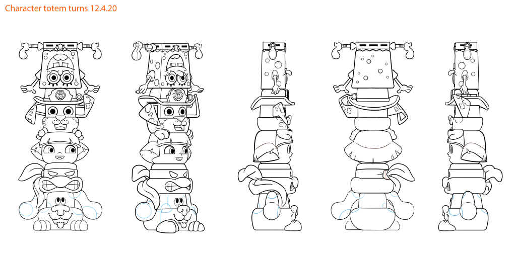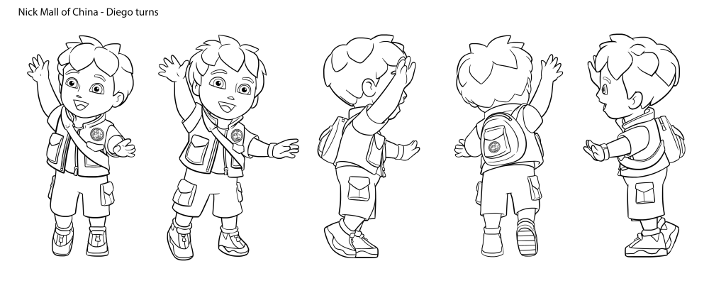 Creating technical drawings for the production of sculptures or walk-around character costumes is a trade that involves a keen eye and an understanding of form and space. These are turn poses that I did for Nickelodeon as they were planing attractions at several locations and needed sculpts produced.